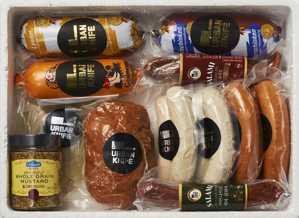 구성 : 브랏부어스트x2, 페퍼부어스트x2, 비어슁켄, 플라이쉬케제, 사우어크라스트, 리오나, 초리조살라미, 페퍼살라미, 겔브부어스트, 홀그레인머스타드 + 보냉가방